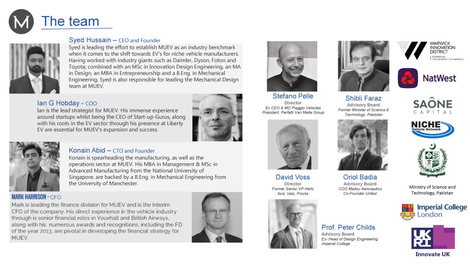 Syed is leading the effort to establish MUEV as an industry benchmark when it comes to the shift towards EV's for niche vehicle manufacturers. Having worked with industry giants such as Daimler, JLR, Dyson, Foton and Toyota; combined with an MSc in Innovation Design Engineering, an MA in Design, an MBA in Entrepreneurship and a B.Eng. in Mechanical Engineering, Syed is also responsible for leading the Mechanical Design team at MUEV.